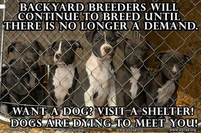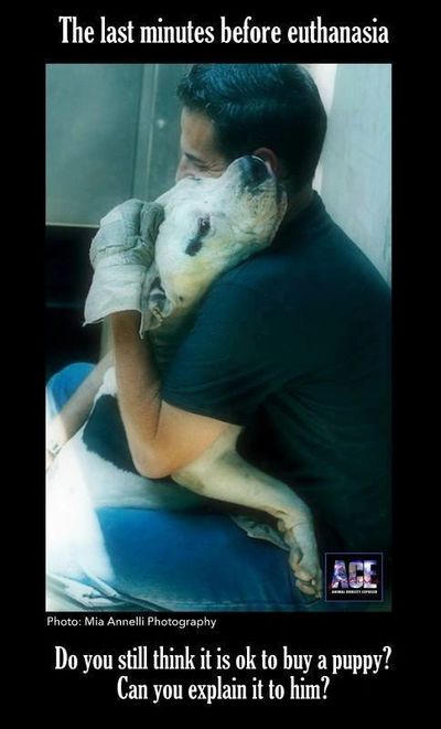 I think our society needs a huge "Wake-up" call. As a shelter manager, I am going to share a little insight with you all...a view from the inside if you will. First off, all of you breeders/sellers should be made to work in the "back" of an animal shelter for just one day. Maybe if you saw the life drain from a few sad, lost, confused eyes, you would change your mind about breeding and selling to people you don't even know. That puppy you just sold will most likely end up in my shelter when it's not a cute little puppy anymore. So how would you feel if you knew that there's about a 90% chance that dog will never walk out of the shelter it is going to be dumped at? Purebred or not! About 50% of all of the dogs that are "owner surrenders" or "strays", that come into my shelter are purebred dogs. The most common excuses I hear are; "We are moving and we can't take our dog (or cat)." Really? Where are you moving to that doesn't allow pets? Or they say "The dog got bigger than we thought it would". How big did you think a Great Dane would get? "We don't have time for her". Really? I work a 10-12 hour day and still have time for my 6 dogs! "She's tearing up our yard". How about making her a part of your family? They always tell me "We just don't want to have to stress about finding a place for her. We know she'll get adopted, she's a good dog". Odds are your pet won't get adopted & how stressful do you think being in a shelter is? Well, let me tell you, your pet has 72 hours to find a new family from the moment you drop it off. Sometimes a little longer if the shelter isn't full and your dog manages to stay completely healthy. If it sniffles, it dies. Your pet will be confined to a small run/kennel in a room with about 25 other barking or crying animals. It will have to relieve itself where it eats and sleeps. It will be depressed and it will cry constantly for the family that abandoned it. If your pet is lucky, I will have enough volunteers in that day to take him/her for a walk. If I don't, your pet won't get any attention besides having a bowl of food slid under the kennel door and the waste sprayed out of its pen with a high-powered hose. If your dog is big, black or any of the "Bully" breeds (pit bull, rottie, mastiff, etc) it was pretty much dead when you walked it through the front door. Those dogs just don't get adopted. It doesn't matter how 'sweet' or 'well behaved' they are. If your dog doesn't get adopted within its 72 hours and the shelter is full, it will be destroyed. If the shelter isn't full and your dog is good enough, and of a desirable enough breed it may get a stay of execution, but not for long . Most dogs get very kennel protective after about a week and are destroyed for showing aggression. Even the sweetest dogs will turn in this environment. If your pet makes it over all of those hurdles, chances are it will get kennel cough or an upper respiratory infection and will be destroyed because shelters just don't have the funds to pay for even a $100 treatment. Here's a little euthanasia 101 for those of you that have never witnessed a perfectly healthy, scared animal being "put-down". First, your pet will be taken from its kennel on a leash. They always look like they think they are going for a walk happy, wagging their tails. Until they get to "The Room", every one of them freaks out and puts on the brakes when we get to the door. It must smell like death or they can feel the sad souls that are left in there. It's strange, but it happens with every one of them. Your dog or cat will be restrained, held down by 1 or 2 vet techs depending on the size and how freaked out they are. Then a euthanasia tech or a vet will start the process. They will find a vein in the front leg and inject a lethal dose of the "pink stuff". Hopefully your pet doesn't panic from being restrained and jerk. I've seen the needles tear out of a leg and been covered with the resulting blood and been deafened by the yelps and screams. They all don't just "go to sleep", sometimes they spasm for a while, gasp for air and defecate on themselves. When it all ends, your pets corpse will be stacked like firewood in a large freezer in the back with all of the other animals that were killed waiting to be picked up like garbage. What happens next? Cremated? Taken to the dump? Rendered into pet food? You'll never know and it probably won't even cross your mind. It was just an animal and you can always buy another one, right? I hope that those of you that have read this are bawling your eyes out and can't get the pictures out of your head I deal with everyday on the way home from work. I hate my job, I hate that it exists & I hate that it will always be there unless you people make some changes and realize that the lives you are affecting go much farther than the pets you dump at a shelter. Between 9 and 11 MILLION animals die every year in shelters and only you can stop it. I do my best to save every life I can but rescues are always full, and there are more animals coming in every day than there are homes. My point to all of this...DON'T BREED OR BUY WHILE SHELTER PETS DIE! Hate me if you want to. The truth hurts and reality is what it is. I just hope I maybe changed one person's mind about breeding their dog, taking their loving pet to a shelter, or buying a dog. I hope that someone will walk into my shelter and say "I saw this and it made me want to adopt". THAT WOULD MAKE IT WORTH IT. ~ Author unknown