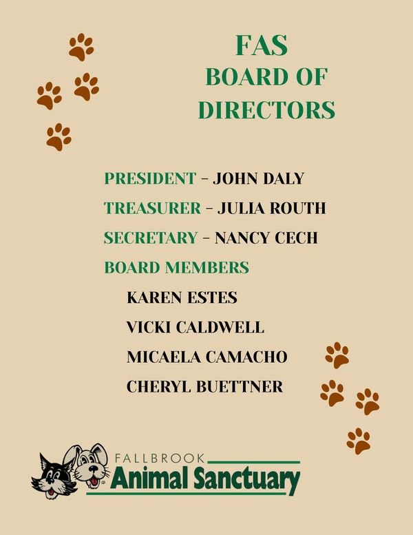 The Fallbrook Animal Sanctuary's Board of Directors consists of a dedicated team of volunteers committed to providing a safe haven for the animals that find their way to FAS, while supporting the community with resources such as free and low-cost spay/neuter clinics.